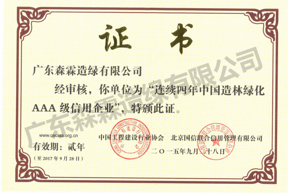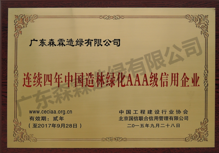 連續(xù)四年中國(guó)造林綠化AAA級(jí)信用企業(yè)證書(shū)